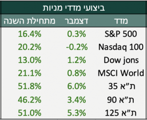 בחודש דצמבר נשברו שיאים הן בארה״ב והן בישראל כאשר הפער בין ביצועי השוק הישראלי לשווקים הגלובליים ממשיך להתרחב. מדדי תל אביב עם עלייה של כ-5% מול כ- 0.5% בממדים בארה״ב, מובילים לפער של מעל ל-30% מתחילת שנה.