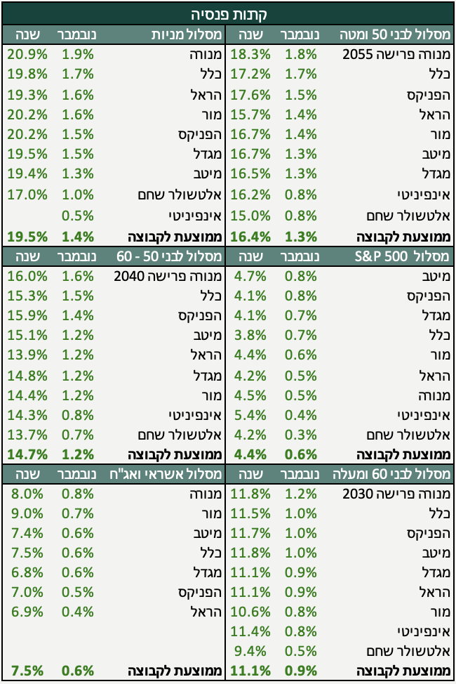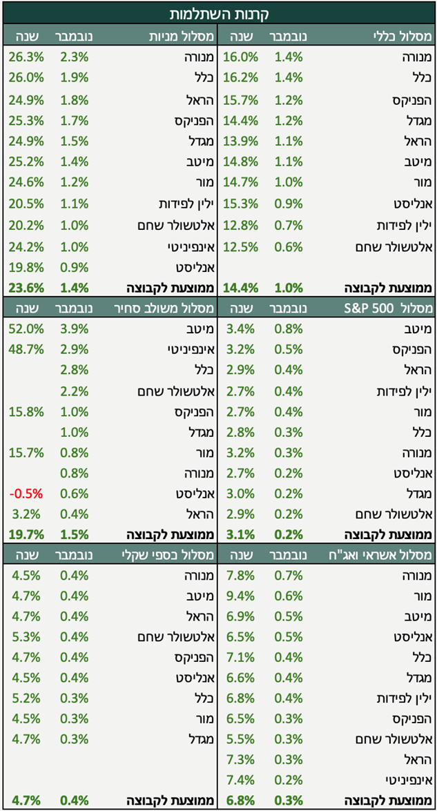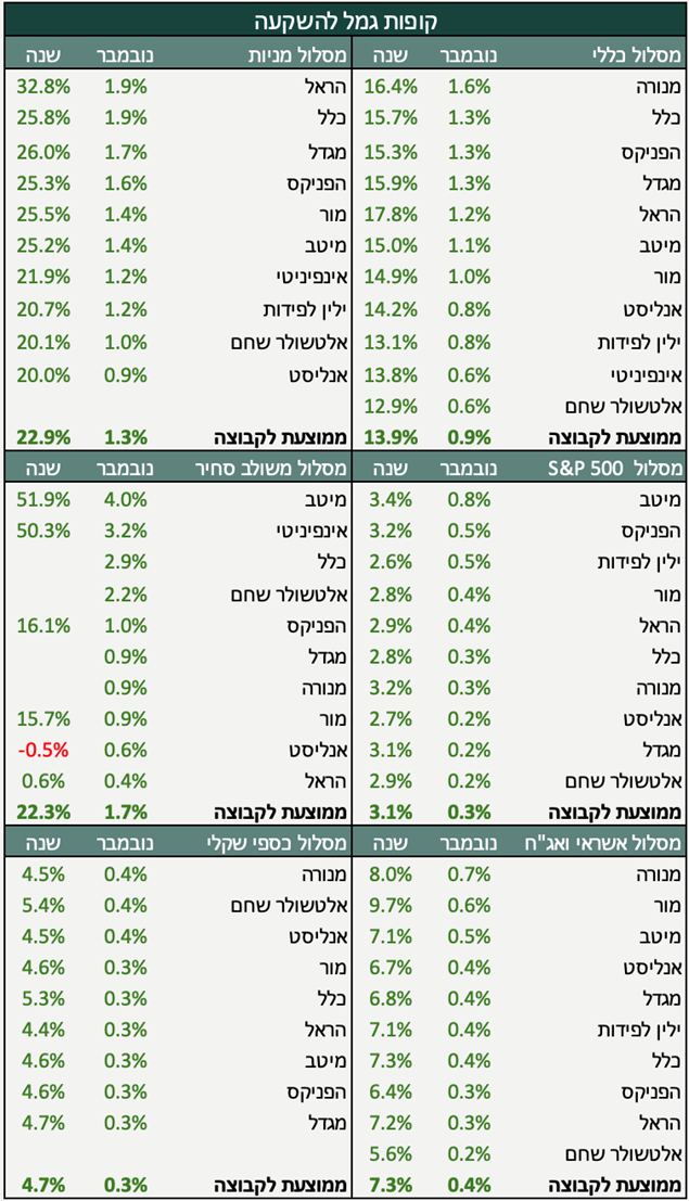 המדדים בארץ נשאו על גבם את ביצועי המסלולים לחודש נובמבר. הסנטימנט החיובי הנמשך בישראל, נתונים מעורבים בארה״ב והחלשות הדולר, העמיקו את הפער בין המסלולים המנייתיים והכללים החשופים לישראל, לבין מסלולים מוטים לחו״ל וממחישים את היתרון של מסלולים מנוהלים ומפוזרים.